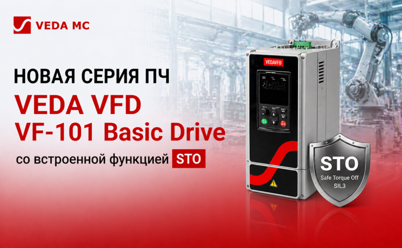 Компания представляет новую серию преобразователей частоты VEDA VFD VF-101 Basic Drive со встроенной функцией STO (Safe Torque Off). Это современное решение для предприятий, где предъявляются повышенные требования к промышленной безопасности, надежности оборудования и контролируемой остановке приводных механизмов.